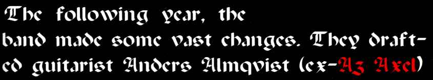 Az Axel recorded at least one demo in 1985 featuring the songs "Az Axel", "Danger" & "Fear" (this demo has often been mistaken for that of a Belgian band, likely due to the existence of a Belgian band called Axel).