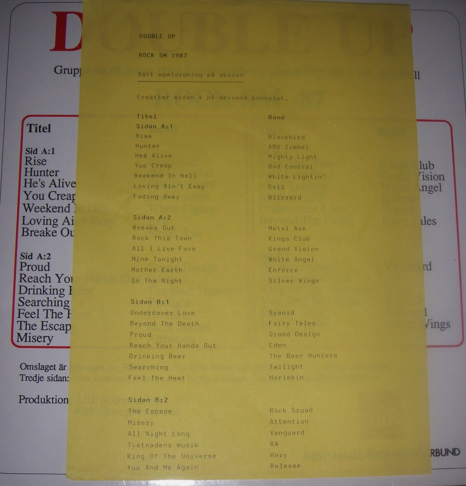 The bands on this compilation qualified directly to swedish ROCK SM 1987. The back-cover lists the songs in the wrong order, some copies came with a insert listing the correct tracklist. Features great heavy metal acts suchs as BLACKBIRD, VANGUARD, BLIZZARD, METAL AXE, ATTENTION, HAZY and FAIRY TALES.